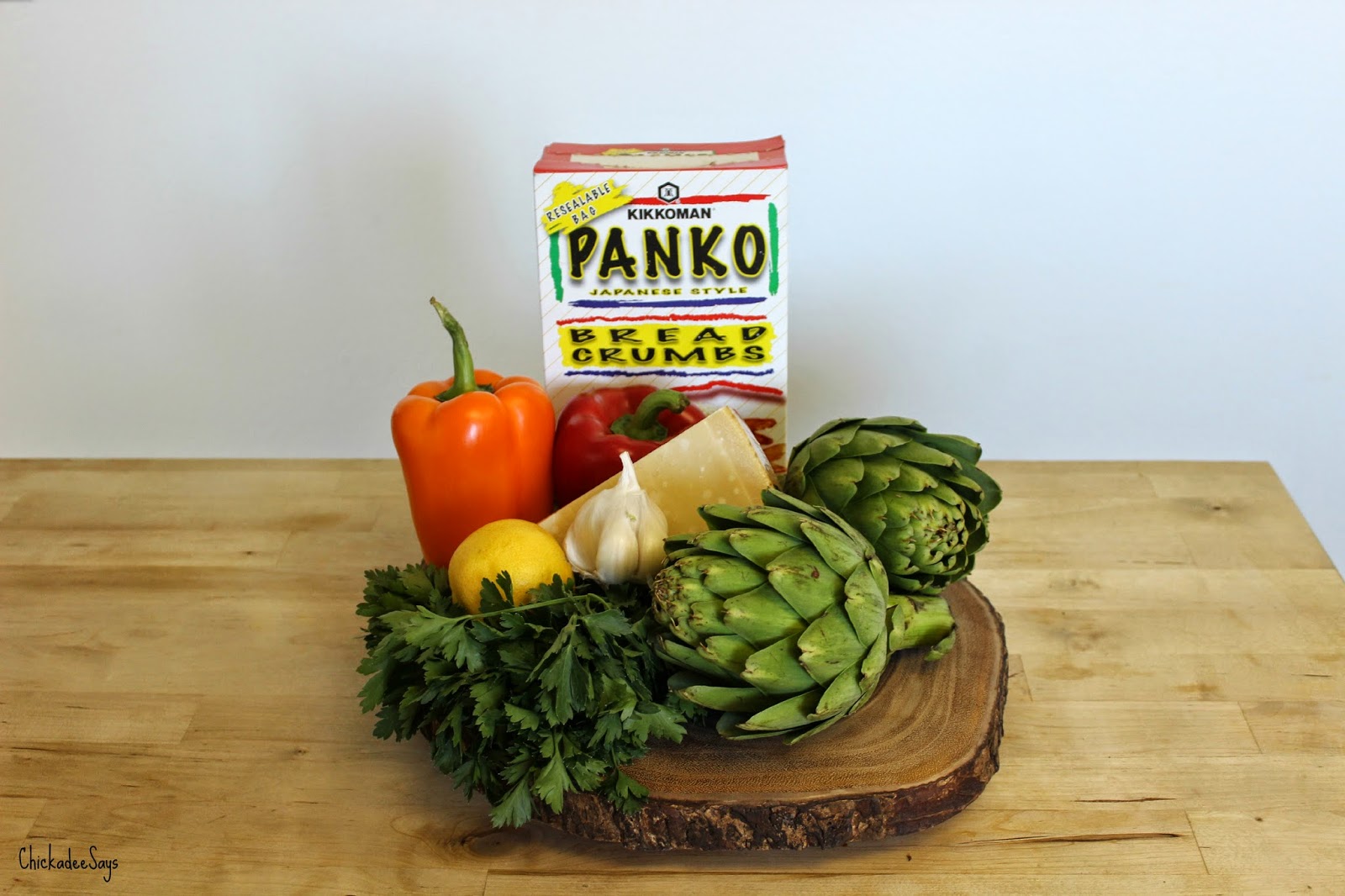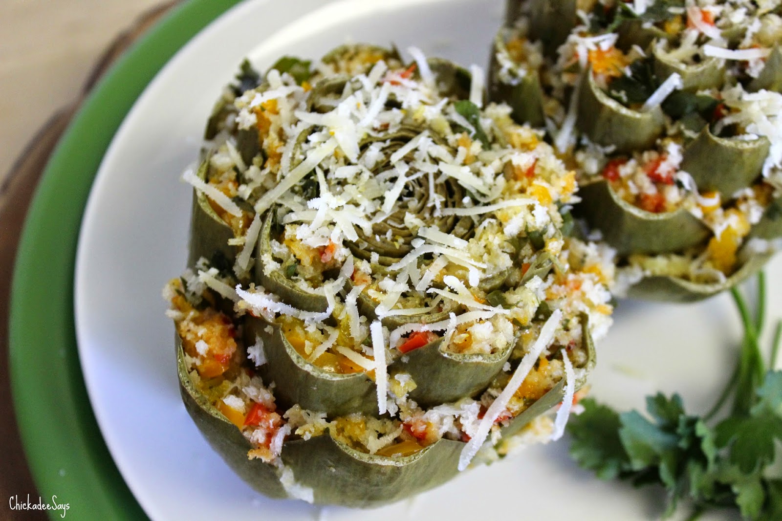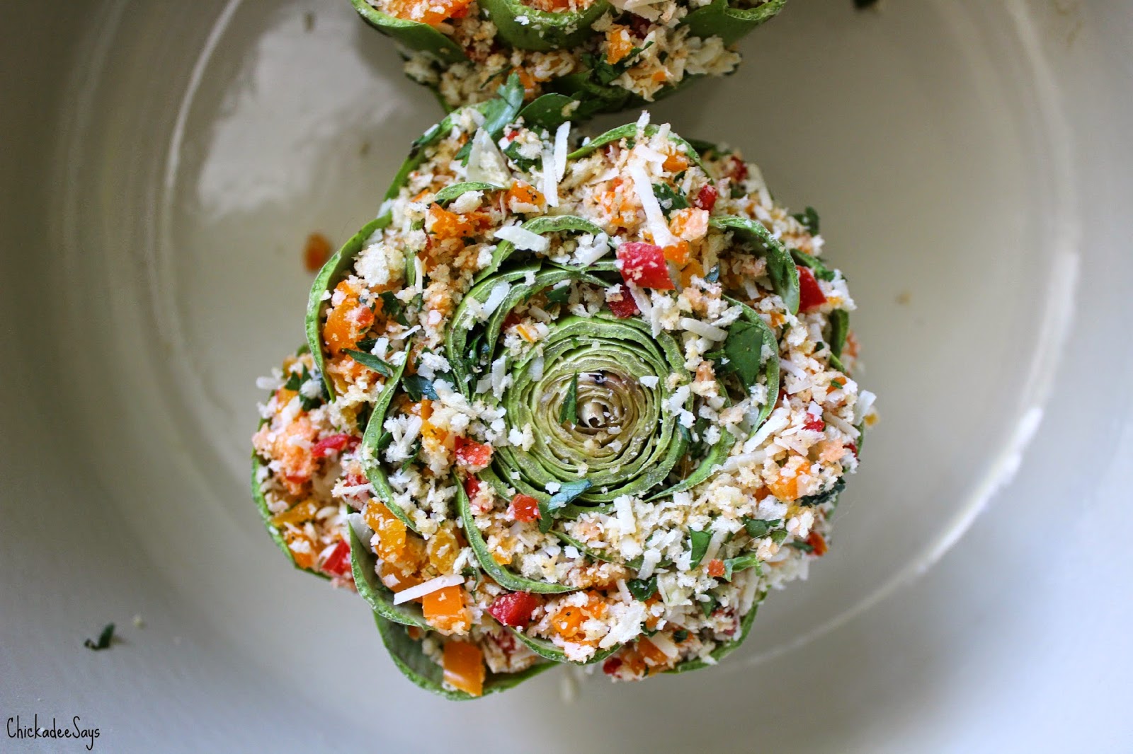 Now, I like artichokes in every way, dips, steamed then dipped in butter, so I thought I’d try something different- stuff them. Stuffed artichokes are a bit more filling than just the leaves and the peppers give them a fresh, zesty pop!